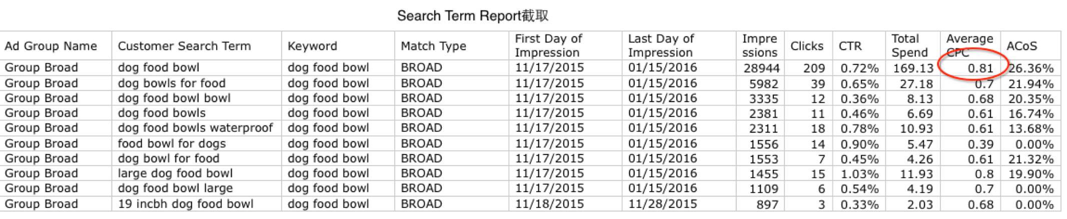 不同的customer search term来触发dog food bowl这个出价关键词,我的点击扣费是不一样的,可以看Average CPC这一列。