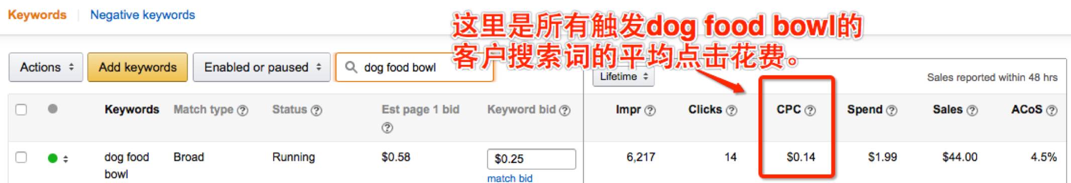 我们在后台PPC页面看到的CPC,只是触发dog food bowl的所有customer search term的平均点击花费。